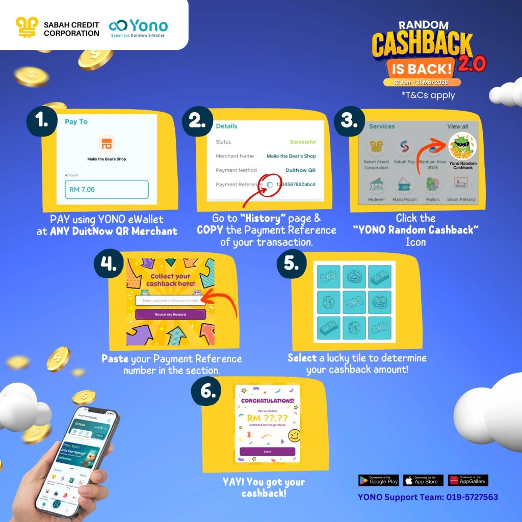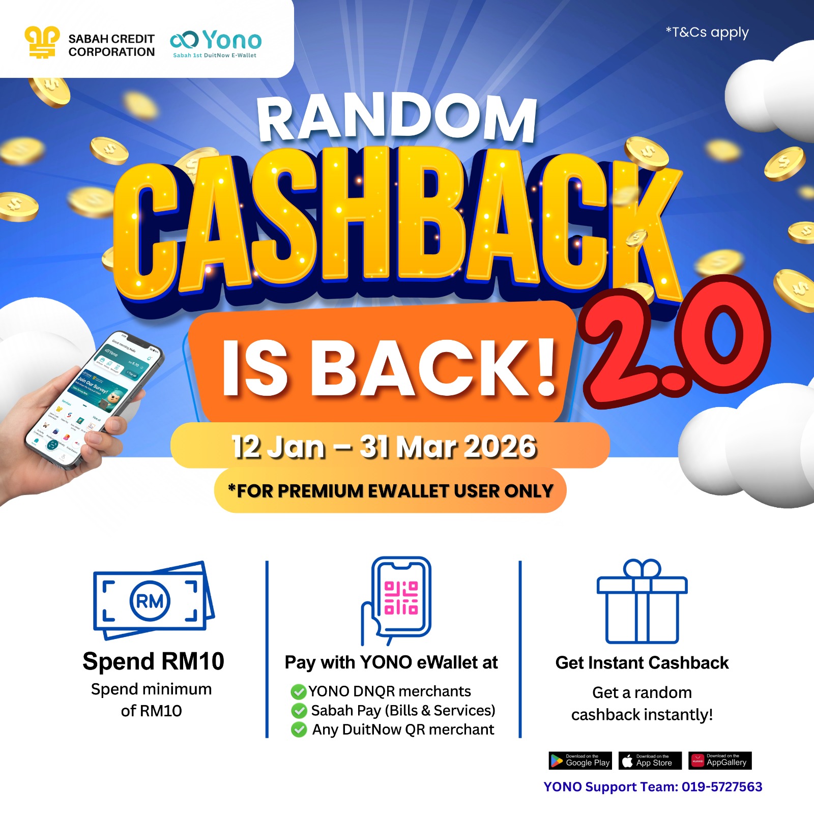 Pay with YONO eWallet and get random cashback with every spend from RM10. No cap. Just tap, pay & enjoy the surprise!
